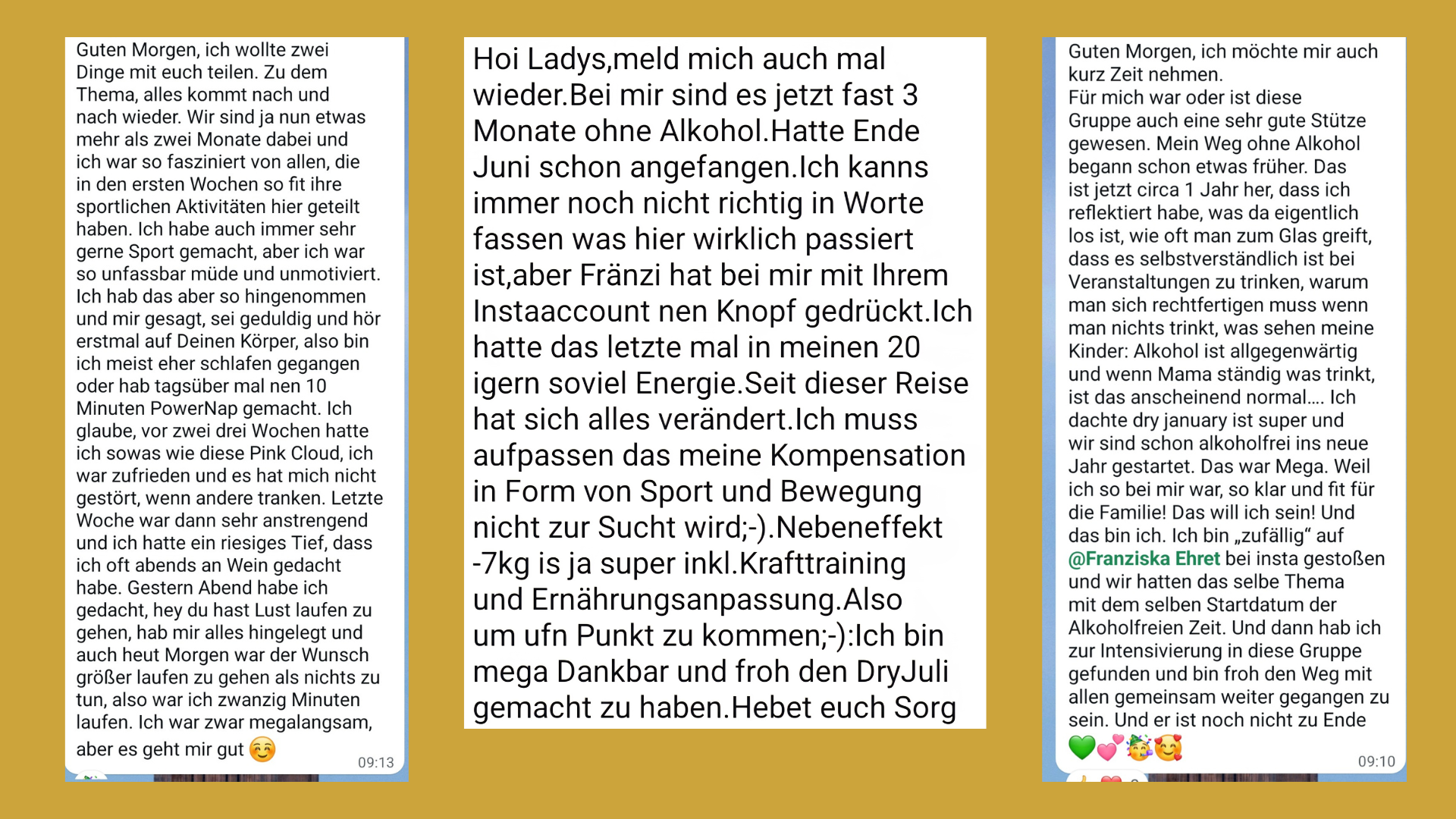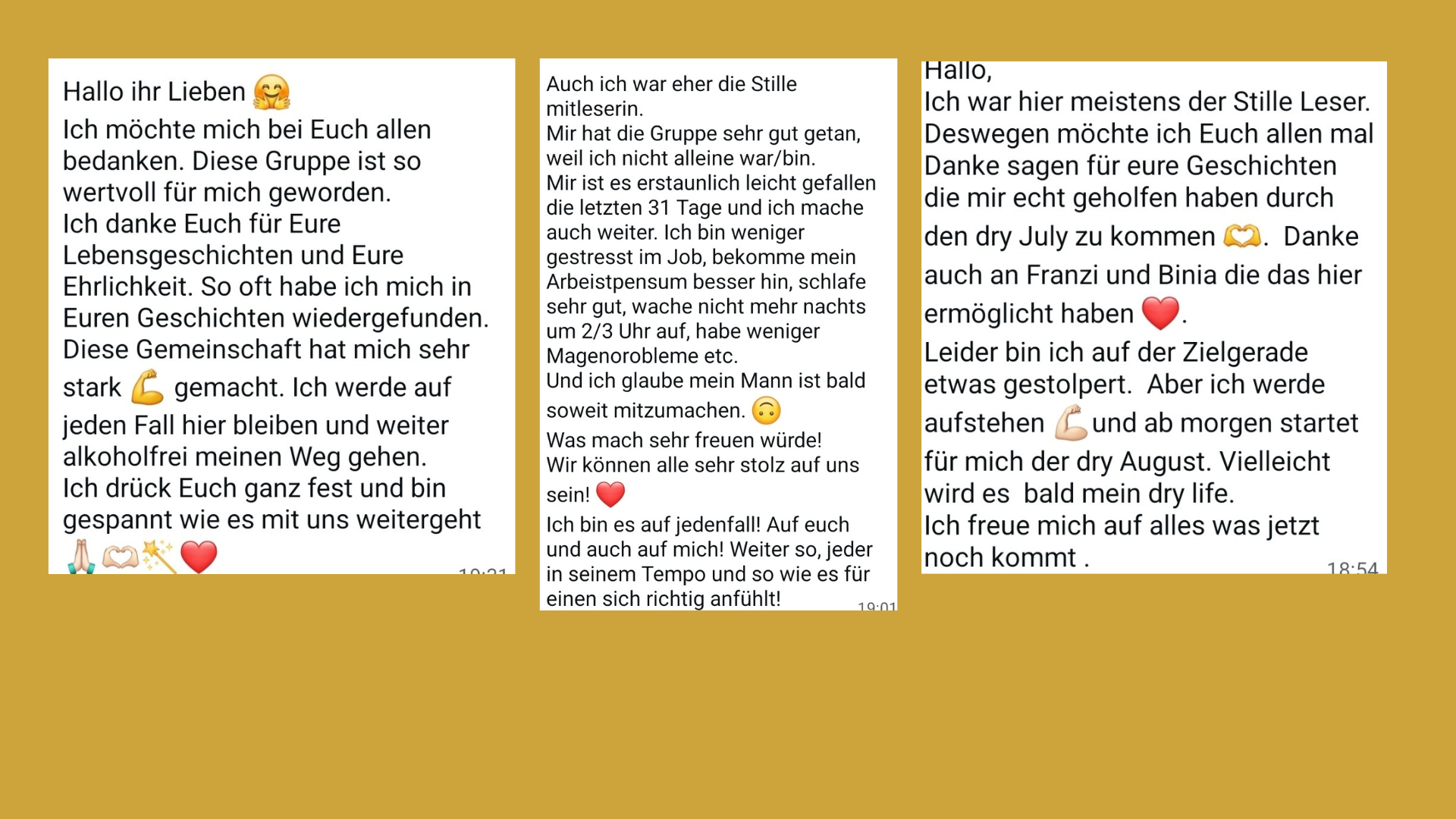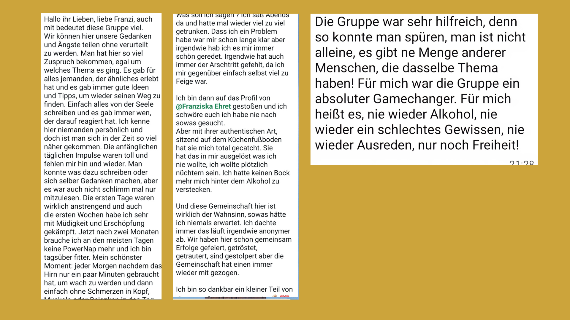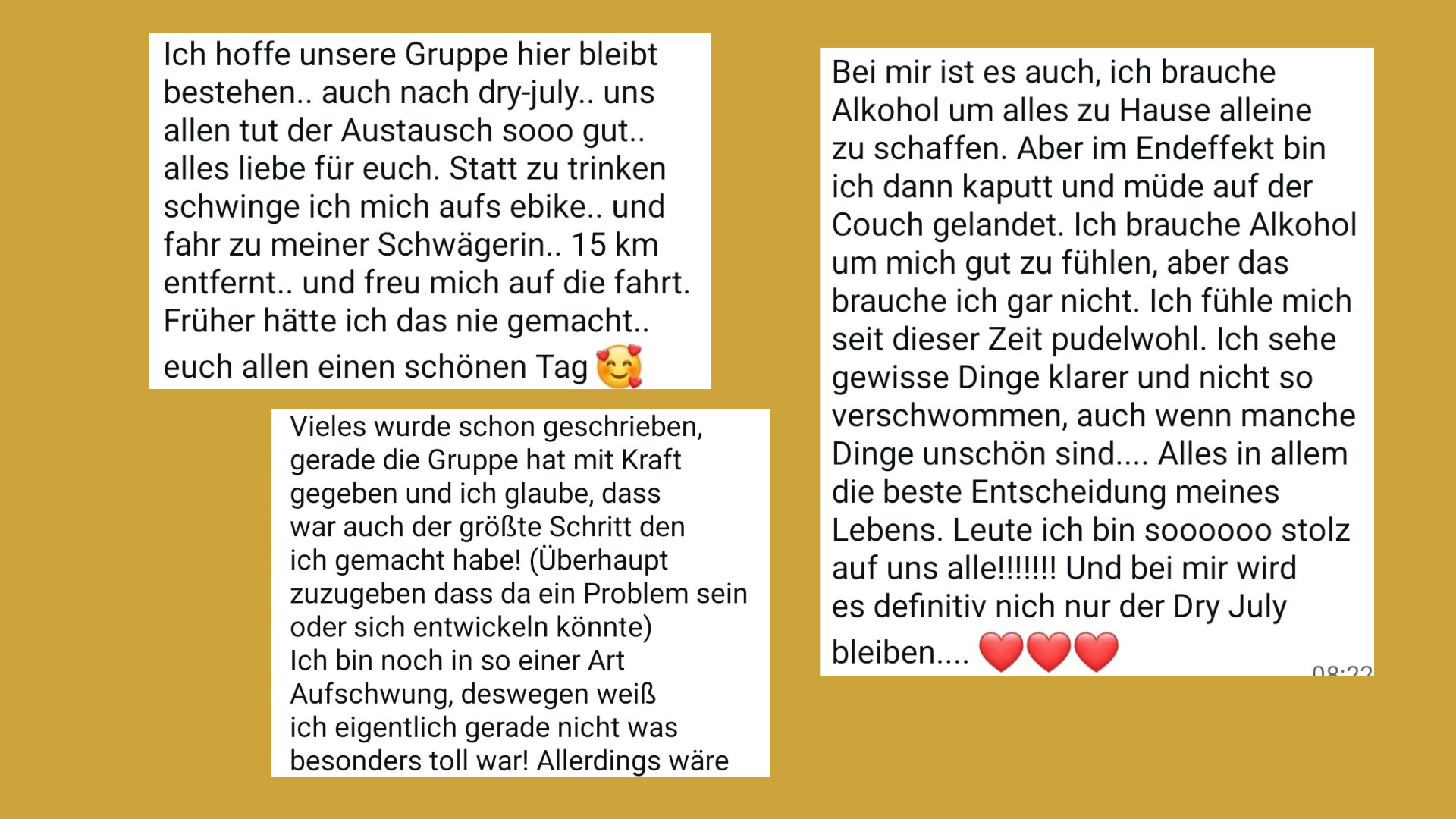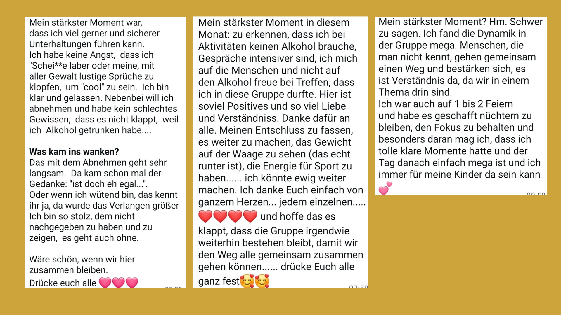 Damals war Alkohol noch ein fester Bestandteil meines Lebens aber mit der Zeit hab ich neue, gesunde Strategien und Wege für mich entwickelt und der Alkohol hat seine Aufgabe und seine Kraft verloren.